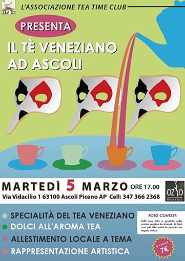 ASCOLI PICENO – L’associazione Tea Time Club dà il benvenuto al Carnevale con una pregevole iniziativa che porterà “Il tè veneziano ad Ascoli”, martedì 5 marzo alle ore 17 presso Ozio (Cacciannanzeria e Osteria in via Vidacilio,1). Nel corso della serata, oltre a degustare diverse qualità di tè accompagnato da dolci tipici del periodo carnascialesco, sarà possibile ammirare un apposito allestimento di contenitori in argento, teiere, tazzine fino ad arrivare a zuccheriere: oggetti d’epoca che hanno caratterizzato l’Italia del Settecento, appartenenti alla collezione di Gianni Brandozzi. A rendere ancora più interessante l’iniziativa, sarà la rappresentazione artistica di tre maschere veneziane a cura dell’attore e regista pedagogo Francesco Aceti. Alla serata sarà abbinato anche il contest fotografico “Fatti una foto e postala sulla nostra pagina facebook, la foto con più like avrà in premio un regalo unico”.