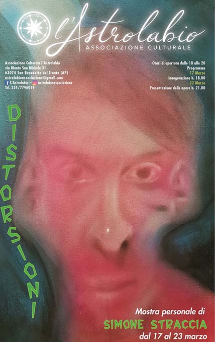SAN BENEDETTO DEL TRONTO – Proseguono gli appuntamenti con l’arte organizzati dall’Associazione Culturale “L’Astrolabio” di San Benedetto del Tronto che presenta “Distorsioni”, mostra personale di Simone Straccia, visitabile dal 17 al 23 marzo, dalle ore 18 alle 20, a ingresso libero, presso la sede dell’Associazione in via Monte San Michele 31 a San Benedetto del Tronto. L’inaugurazione è prevista domenica 17 marzo alle ore 18 mentre venerdi 22 marzo alle ore 21 ci sarà la presentazione delle opere, un incontro con il giovane artista che illustrerà le sue creazioni, il suo percorso artistico e interagirà con i visitatori. I quadri di Simone Straccia sono realizzati con tecniche miste, in prevalenza pittura ad olio, il linguaggio con cui si esprime è il pittorico figurativo che ha come soggetto predominante il ritratto psicologico. Una vera immersione nei lati ombrosi della mente umana, un percorso in cui gli autoritratti identificano l’esistenza del suo autore, la ricerca rivolta alla scoperta del proprio inconscio e della propria psiche. L’espressione dei volti distorti e deformati che vediamo nelle sue tele trovano riscontro nelle esperienze del suo vissuto e nell’influenza di due grandi artisti del ‘900 come Francis Bacon e Lucian Freud, influenza determinante per l’evoluzione della sua cifra stilistica. L’essenza dell’artista si può trovare nelle parole della curatrice della mostra, Raffaella Chiappini: «Lui è i suoi quadri e i suoi quadri sono lui». Info: astrolabioassociazione@gmail.com – Facebook : L’Astrolabio