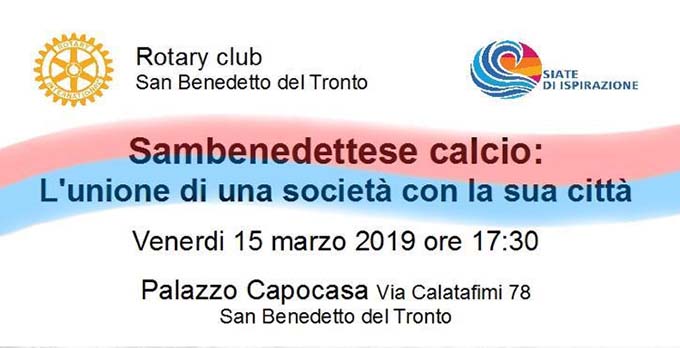 SAN BENEDETTO DEL TRONTO – Si chiama “Sambenedettese Calcio – L’Unione di una Società con la sua Città” il convegno organizzato, per venerdì 15 marzo, dal Rotary Club di San Benedetto del Tronto. L’incontro si terrà a partire dalle ore 17,30 nella Sala Convegni del Palazzo Capocasa (via Calatafimi 178) e si aprirà con il saluto delle autorità: il presidente del Rotary Club San Benedetto del Tronto Alberto De Angelis, il sindaco Pasqualino Piunti e il presidente della Sambenedettese Franco Fedeli. Il primo dei relatori sarà il prof.Gianluca Antonucci, dovente dell’Università degli studi di Chieti e Pescara che parlarà della crescita dei giovani atleti e le difficoltà delle società di calcio di provincia.
