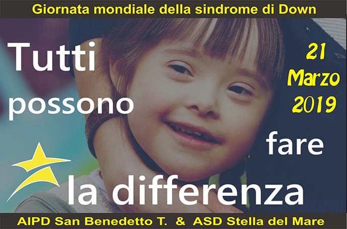SAN BENEDETTO DEL TRONTO – In occasione della imminente Giornata Mondiale Persone Down in tutto il mondo si realizzerà nella stessa data ed al medesimo orario un “flash mob” (balletto) di sensibilizzazione nella giornata di giovedì 21 marzo alle ore 16. A San Benedetto del Tronto il balletto sarà organizzato dall’Aipd locale (Associazione Italiana Persone Down) in collaborazione con la Asd Stella del Mare e si terrà in Viale Secondo Moretti, nei pressi del Gran Caffé Sciarra. Tutta la cittadinanza è invitata a partecipare per dimostrare la sua vicinanza alle persone Down, e disabili in generale, che purtroppo ancora oggi si trovano a dover combattere atteggiamenti discriminatori nei loro confronti. Lo slogan sarà #cittadini come voi. «Ci auguriamo la vicinanza di tutti e vi aspettiamo numerosi. Venite a ballare con noi!» affermano dall’Aipd San Benedetto del Tronto e Asd Stella del Mare.