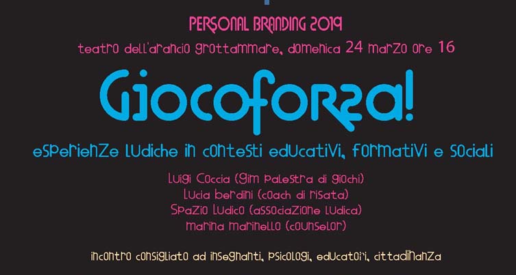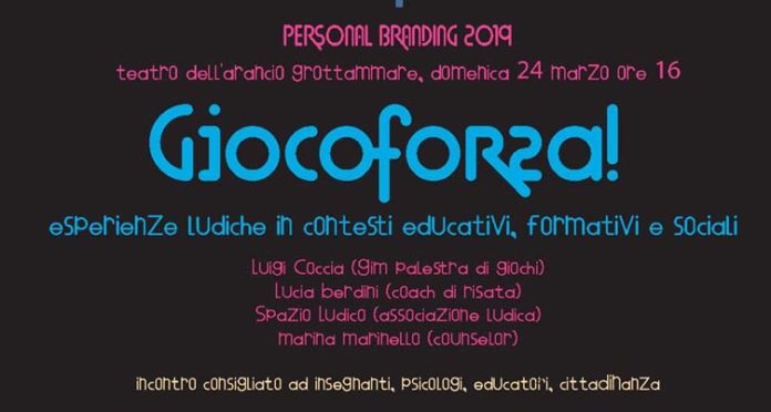 GROTTAMMARE – Tornano anche quest’anno gli stimolanti appuntamenti formativi di Personal Branding: l’edizione 2019 si intitola “Ciascuno è perfetto” e si svolerà tra marzo e giugno a Grottammare, Fermo e San Benedetto del Tronto. Il primo incontro è “Giocoforza!” e si svolgerà domenica 24 marzo alle ore 16 presso il Teatro dell’Arancio di Grottammare. Il gioco è un atto libero e culturale, di crescita e di socializzazione e se bene articolato può divenire uno strumento davvero efficace per veicolare competenze.
