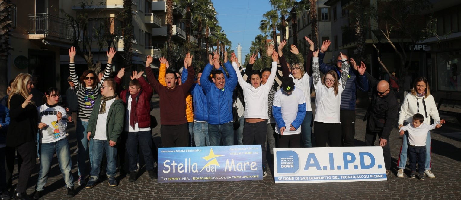 SAN BENEDETTO DEL TRONTO – Si è svolto ieri a San Benedetto del Tronto, come pure in tutte le piazze del mondo, il flash mob di sensibilizzazione sulle persone con Sindrome di Down. Lo slogan? #Cittadini come voi. Organizzato da Aipd San Benedetto in collaborazione con Asd Stella del Mare, la manifestazione ha radunato in viale Secondo Moretti tantissimi ragazzi che hanno ballato e scherzato insieme ai vari passanti incuriositi e divertiti. «Sono molto felice per essere riusciti ad organizzare questo flash mob anche a San Benedetto» afferma Rosa Gabriella, Presidente Aipd San Benedetto «La nostra sezione è nata da poco ed ho in progetto di organizzare altre manifestazioni perché ci sia sempre maggiore sensibilità sulle potenzialità e sul valore aggiunto che i nostri ragazzi possono dare alla comunità. Per i nostri ragazzi associati lavoriamo molto sotto il profilo delle autonomie perché sogniamo un inserimento lavorativo che doni loro la piena dignità di cittadini: cittadini come voi. Ringrazio Roberto Ciferni e la Stella del Mare per l’importante sostegno ricevuto nell’organizzare di questa giornata. Ringrazio le famiglie e i ragazzi che ci hanno raggiunto anche da fuori città, Caffè Sciarra, Walter e Sara». Entusiasta anche Roberto Ciferni della Stella del Mare: «É stato un piacere dare sostegno a questa iniziativa, vedere la gioia nei volti di questi ragazzi riempie il cuore. Nel nostro piccolo cerchiamo di fare il possibile attraverso lo sport perché nessuno rimanga indietro. Tutti possono fare la differenza:stelladelmare.org».