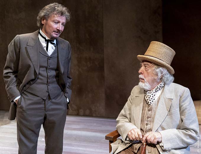 Mauri regge la scena ancora come un leone dall’alto dei suoi novant’anni (settanta passati sul palco per la cronaca). Tiene assieme un gruppo tutto sommato affiatato composto dall’ottimo Roberto Sturno (Ivan), Laurence Mazzoni (Dimitrij), Pavel Zelinsky (Aleksej), Paolo Lorima (lo starec Zosima), Luca Terracciano (Smerdjanov). La regia è snella, essenziale, funzionale alle cupezza, alla lancinante disperazione del romanzo in cui Dostoevskij non moralizza o pontifica – semmai si sforza di capire l’altro – limitandosi a gettare luce su squarci inquietanti dietro le quinte della realtà umana, dominata da quella che un grande teologo del Novecento, Don Italo Mancini, chiamò «teoria dei doppi pensieri», per rimarcare l’ambivalenza delle idee mai connotate da una sola chiave interpretativa ma gonfiate dall’ambiguità, dalla doppiezza, dalla dualità.
