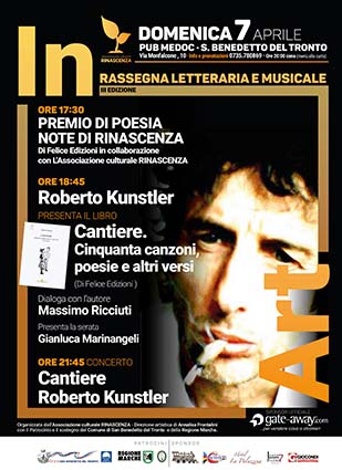 Intorno alle ore 18,45 il cantautore Roberto Kunstler presenterà in anteprima nazionale il suo libro “Cantiere. Cinquanta canzoni, poesie e altri versi” quarto volume della collana Note di Rinascenza diretta da Annalisa Frontalini, edito dalla Di Felice Edizioni. Il nuovo libro di Kunstler è una raccolta di testi, il cui titolo rimanda al costante lavoro di costruzione, composta da due sezioni: nella prima, sono raccolte le canzoni più significative dei suoi album e di quelli di Sergio Cammariere, nella seconda sono contenute poesie tratte da una vasta produzione, in gran parte ancora inedita. Diaolgherà con l’autore il giornalista Massimo Ricciuti. Dopo cena, intorno alle ore 22, il pubblico di In Art potrà ascoltare Kunstler in concerto.