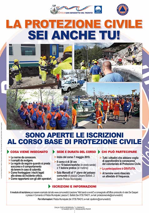 SAN BENEDETTO DEL TRONTO – Sono aperte le iscrizioni al corso di base di Protezione Civile. Il corso, che inizierà martedì 7 maggio, è di 30 ore con 9 lezioni teoriche (in orario serale) e 2 pratiche. Al termine verrà rilasciato un attestato di frequenza. Durante il corso si parlerà del Sistema Nazionale di Protezione Civile, dei rischi presenti sul nostro territorio e del comportamento da tenere prima e dopo una calamità, della loro pianificazione anche in ambito familiare, delle regole e del comportamento da seguire quando si presta assistenza, di come fronteggiare i rischi legati allo stress da incidente critico, delle dinamiche relazionali all’interno di un gruppo ed in particolare dei rapporti con gli altri operatori. La partecipazione al corso è gratuita. Possono aderire tutti i cittadini maggiorenni che abbiano voglia di dedicare un po’ del proprio tempo per approfondire la conoscenza del territorio dove vivono e di come è possibile partecipare attivamente alle attività di prevenzione e di soccorso. Per informazioni rivolgersi alla Polizia Municipale, ufficio Protezione Civile (Lunedì, mercoledì e venerdì: dalle 10:30 alle 13:00 – martedì e giovedì: dalle ore 16:30 alle 18:00), tel 0735 794213 – 0735 794272, e-mail: cipolloniv@comunesbt.it. Il programma del corso e il modello di domanda sono pubblicati sul sito istituzionale www.comunesbt.it (sezione “altri bandi e avvisi”).