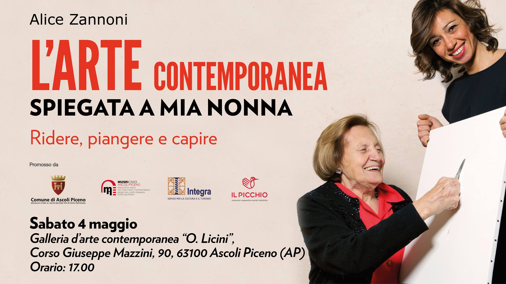 ASCOLI PICENO – I Musei Civici di Ascoli Piceno hanno il piacere di ospitare, sabato 4 maggio alle ore 17, la presentazione del libro “L’arte contemporanea spiegata a mia nonna” (Nfc Edizioni) di Alice Zannoni, il caso editoriale che sta riscuotendo grande consenso tra il pubblico, oltre a solleticare la curiosità anche dei più avversi all’arte contemporanea. L’autrice – in conversazione con Valentina Falcioni, responsabile Pulchra per Ascoli Musei – racconterà l’avventura intrapresa con nonna Zita presso la Galleria D’Arte Contemporanea “Osvaldo Licini” situata nel suggestivo ex convento di Sant’Agostino. L’evento sarà anche l’occasione per visitare la preziosa collezione del Museo con una particolare attenzione alle opere di Osvaldo Licini, a cui il museo stesso è intitolato, guidati dal “Metodo Zannoni”. L’evento è promosso dal Comune di Ascoli Piceno, Musei Civici di Ascoli Piceno, Integra – Servizi per la Cultura e il Turismo, Pulchra – Soc Coop Culturale e Consorzio Il Picchio.