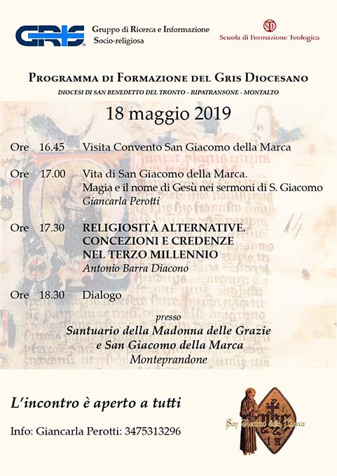 La formazione affronterà il fenomeno delle Nuove Religiosità e dello spiritualismo con la storia della loro origine e con le loro credenze e le loro concezioni, ma anche alle conseguenze che queste realtà contribuiscono a generare. Il primo incontro si terrà al Santuario della Madonna delle Grazie e di San Giacomo della Marca a Monteprandone il 18 maggio, dalle ore 16.30 alle 19.30 e i relatori saranno: Antonio Barra Diacono e Presidente del Gris Diocesano e Giancarla Perotti Consigliere Nazionale del Gris e docente di Storia delle Religioni alla Scuola di Formazione Teologica.