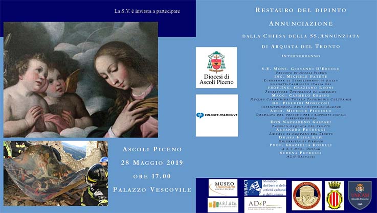 ASCOLI PICENO – Si terrà martedì 28 maggio presso il Palazzo Vescovile di Ascoli Piceno, con inizio alle ore 17, la cerimonia per la riconsegna della tela della chiesa della SS. Annunziata di Arquata del Tronto raffigurante l’Annunciazione. Il restauro del dipinto, che è stato interamente finanziato dalla Colgate-Palmolive e dai contributi dei suoi dipendenti, che hanno immediatamente voluto manifestare la loro vicinanza ai territori colpiti dal terremoto, con questo gesto simbolico di solidarietà e vicinanza, è stato coordinato dall’Università di Camerino ed in particolare dalla prof.ssa Graziella Roselli, che ha seguito le attività sia di diagnostica scientifica dell’opera prima del restauro, sia degli interventi sull’opera.