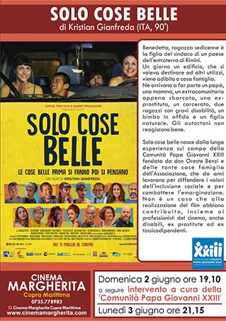 CUPRA MARITTIMA – Al Cinema Margherita di Cupra Marittima è in programma un film per parlare di amicizia amore e solidarietà: “Solo cose belle”, opera prima del regista Kristian Gianfreda. La proiezione è prevista domenica 2 maggio alle ore 19,10 – in cui ci sarà anche un incontro con alcune realtà del territorio che si ispirano ai principi del film e all’Associazione Comunità Papa Giovanni XXIII’ fondata da Don Oreste Benzi – e lunedì 3 maggio, alle ore 21,15. La pellicola, oltre ad essere divertente, ha una storia molto attuale. In un momento storico in cui rabbia e diffidenza verso l’altro dominano la cronaca, arriva questa commedia corale italiana che racconta con delicatezza, humour e verità la vita in una casa famiglia e le reazioni che può scatenare il doversi confrontare all’improvviso con questa movimentata realtà. Un imprimatur di veridicità, arricchito da un ottimo cast, che unisce attori professionisti (fra gli altri Giorgio Borghetti, Carlo Maria Rossi, Erica Zambelli, Patrizia Bollini) ed esordienti, come i due giovani protagonisti, Idamaria Recati e Luigi Navarra, Francesco Yang, 14enne cinese solare e pieno di vita reso disabile da un’ipossia alla nascita, che vive realmente in una casa famiglia e il 40enne Marco Berta, che frequenta da anni un centro diurno dell’associazione.