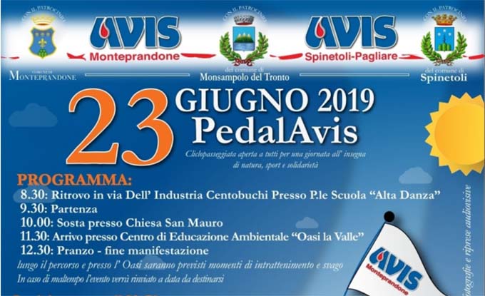 MONTEPRANDONE – “Una ciclopasseggiata aperta a tutti per una giornata all’insegna di natura, sport e solidarietà”. Tutto questo è PedalAvis, l’evento organizzato dalle Avis Comunali di Monteprandone e Spinetoli-Pagliare in collaborazione con l’Unione Sportiva Acli Comitato provinciale di Ascoli Piceno, la Federvol Protezione Civile sezione di Monteprandone, la Croce Gialla di Stella di Monsampolo e il patrocinio dei Comuni di Monteprandone, Monsampolo del Tronto e Spinetoli. «In un momento storico in cui le Associazioni di Volontariato sono chiamate a coalizzarsi e fare rete – spiega Marcello Fratini, presidente dell’Avis Comunale di Monteprandone – è giusto e fisiologico cercare collaborazioni “solidali” per promuovere i valori comuni del dono, dello sport e del rispetto per gli altri e per l’ambiente che ci circonda».