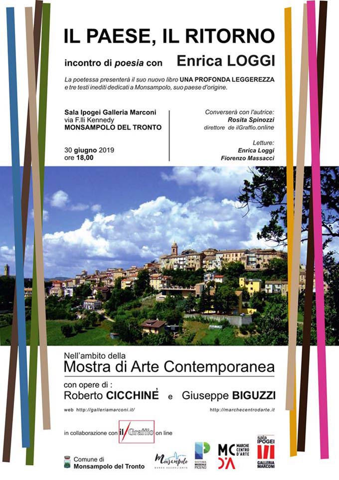 MONSAMPOLO DEL TRONTO – Domenica 30 giugno, alle ore 18, presso la Sala Ipogei “Galleria Marconi” a Monsampolo del Tronto ci sarà “Il Paese, il Ritorno” incontro di poesia con Enrica Loggi. La poetessa presenterà il suo nuovo libro “Una profonda leggerezza” e tre testi inediti dedicati a Monsampolo, suo paese d’origine. Converserà con l’autrice Rosita Spinozzi, direttore de ilGraffio.online, a leggere i testi insieme a Enrica Loggi ci sarà Fiorenzo Massacci. Le lettura rientra nelle manifestazioni organizzate nell’ambito della mostra di arte contemporanea “Tempo Presente”, doppia personale che presenta le opere di Giuseppe Biguzzi e Roberto Cicchinè. L’evento è organizzato dal Comune di Monsampolo, dal Sistema Museale Piceno e da Marche Centro d’Arte in collaborazione con Il Graffio.online. La Sala Ipogei “Galleria Marconi” si trova in via Fratelli Kennedy a Monsampolo del Tronto. Punto informativo, e prenotazioni Museo della Cripta Chiesa Maria Ss. Assunta- Tel.3771500858.