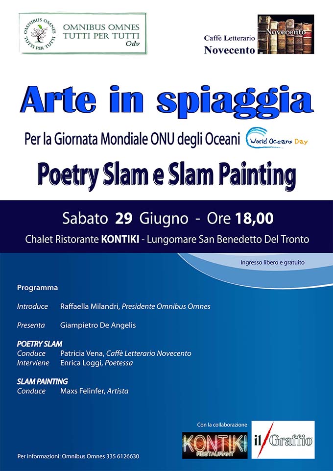 SAN BENEDETTO DEL TRONTO – La Omnibus Omnes è giunta quest’anno alla quinta edizione della importante celebrazione delle “Giornate Mondiali Onu degli Oceani e dei Lavoratori Marittimi”, e il clou dell’evento, dedicato alle scuole, si svolgerà il 28 giugno dalle ore 16.30 in poi, presso la Sala Consiliare del Comune di San Benedetto del Tronto. Per l’occasione saranno premiati, alla presenza del dott.Graziosi della Unric Italia, gli studenti di Scuole Elementari e Scuole Medie di San Benedetto del Tronto, Alba Adriatica, Martinsicuro, Grottammare e Cupra Marittima, per il concorso di disegno “Viviamo il Mare”, per il concorso fotografico “Fotografiamo il Mare”, e per la Borsa di Studio Omnibus per Figli di Lavoratori Marittimi. Prima del 28 giugno però, vi sarà, presso lo chalet Kontiki del Lungomare di San Benedetto, l’evento “Arte in spiaggia”, sabato 29 giugno alle ore 18, dedicato alla “Giornata Mondiale degli Oceani e alla salvaguardia del Mare”, sempre a cura della Omnibus Omnes. Si terrà una “Poetry Slam”, una competizione di poesia con oggetto il mare, in collaborazione con il Caffè Letterario Novecento, diretto dalla poetessa Patricia Vena. Per partecipare, basta scrivere a info@omnibusomnes.org o presentarsi direttamente sul posto il 29 giugno con la propria poesia per registrarsi. La partecipazione è gratuita. La miglior poesia sarà premiata con una targa durante la cerimonia del 28 giugno presso la Sala Consiliare del Comune di San Benedetto del Tronto. Durante l’evento, il Maestro Maxs Felinfer, artista di origini argentine, curerà una Slam Painting dove chiunque potrà esprimere con i pennelli sulla tela bianca il proprio modo di vedere il mare. L’evento “Arte in Spiaggia”, dopo l’introduzione della Presidente Omnibus Raffaella Milandri, sarà condotto da Giampietro De Angelis e vedrà l’intervento della poetessa Enrica Loggi.