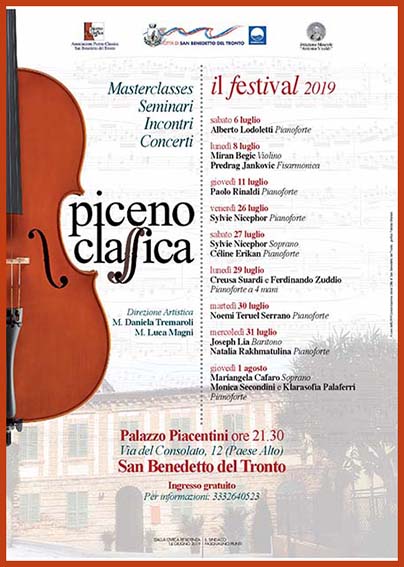 SAN BENEDETTO DEL TRONTO – Tra le manifestazioni protagoniste dell’estate in Riviera ritorna anche quest’anno “Piceno Classica”, la raffinata rassegna di musica classica che si snoda per l’intero mese di luglio a San Benedetto del Tronto, sotto la direzione artistica della violoncellista Daniela Tremaroli e del flautista Luca Magni. Anche l’ottava edizione vedrà svolgersi tutte le esibizioni pubbliche presso l’ottocentesco ed elegante Palazzo Piacentini, collocato nel nucleo storico della Città (in via del Consolato 12) e sede della Pinacoteca del Mare e dell’Archivio Storico; in particolare i concerti si terranno nel salone ipogeo denominato “Sala della Poesia”, dalle caratteristiche volte a crociera che gli conferiscono un’acustica pressoché perfetta e che rendono l’ascolto di musica dal vivo un’esperienza unica ed irripetibile.