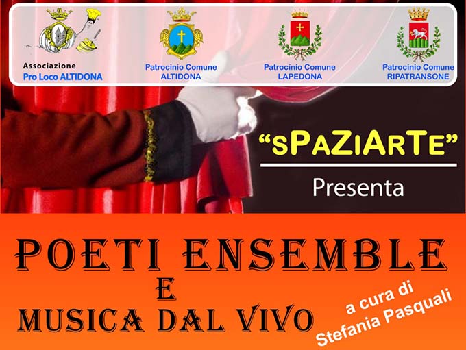 S’intitola “Poeti Ensemble e Musica dal vivo” ed è una manifestazione che ha il pregio di creare un affascinante connubio tra lo splendore della poesia e la bellezza della musica. Il tutto nell’ambito di tre appuntamenti, in tre diverse location, che vedranno protagonisti gli autori Anna Maria Rita Daina, Brunilde Neroni, Gianni Marcantoni, Stefania Pasquali. S’inizierà domenica 14 luglio alle ore 21 nella Sala Comunale di Ripatransone, per poi proseguire domenica 21 luglio nella Chiesa San Nicolò di Lapedona; domenica 28 luglio nella Sala Joyce Lussu di Marina di Altidona. Ad accompagnare i versi ci saranno brani musicali a cura di Claudio Marcantoni (sax), Rebecca Montagna (flauto) Alessandro Montagna (tromba), Silvia Talamonti (chitarra classica), Trio “FaVoLa” di Luca Ciarpella (chitarra, sax, voce solista). L’ingresso è libero.