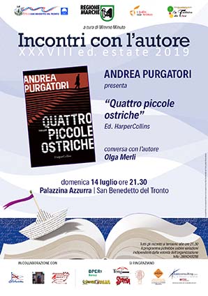 SAN BENEDETTO DEL TRONTO – Andrea Purgatori presenterà “Quattro piccole ostriche”, domenica 14 luglio alle ore 21.30, alla Palazzina Azzurra. In caso di pioggia l’incontro avrà luogo all’Auditorium Comunale “Tebaldini”. L’evento è organizzato dall’associazione “I Luoghi della Scrittura”, la “Fabbrica dei Fiori” con il patrocinio ed il sostegno dell’Amministrazione Comunale e dalla Regione Marche. A conversare con l’autore sarà Olga Merli. Andrea Purgatori è uno dei più importanti sceneggiatori italiani. Tra i film che ha scritto per il cinema si ricordano Il muro di gomma (1991), Il giudice ragazzino (1994), Fortapasc (2009), L’industriale (2011), e per la televisione Caravaggio (2008), Lo scandalo della Banca Romana (2010), Il Commissario Nardone (2012). Attualmente conduce la trasmissione “Atlantide” in onda sul La7, con grande successo di pubblico e critica.