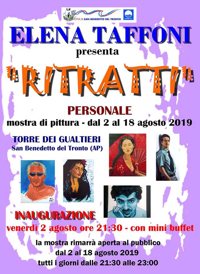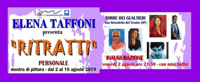 Elena Taffoni presenta “Ritratti”, mostra di pittura visitabile dal 2 al 18 agosto alla Torre dei Gualtieri, Paese Alto di San Benedetto del Tronto. L’inaugurazione è prevista venerdì 2 agosto alle ore 21.30, con mini buffet. Elena Taffoni è una pittrice-musicista, lavora presso Saet-Studio Artistico Elena Taffoni-Disegno e Pittura, ha studiato presso Scuola Libera del Nudo, Accademia di Belle Arti di Macerata. Oggi è una ritrattista –