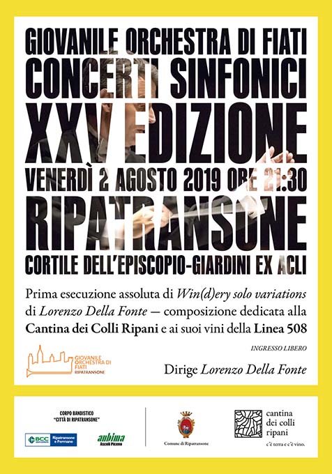 Per continuare con la partnership con il Festival di black music, questa volta organizzato nelle Marche, Fat Fat Fat, che si svolgerà tra Corridonia e Morrovalle dal 2 al 4 agosto. Per l’occasione la Cantina, offrirà ai partecipanti un tipico drink marchigiano, il Paccatello, preparato con il Toscianello Frizzante bianco, uno dei vini della Linea Bollicine, e la gassosa. La propensione alla musica, all’arte e alla cultura che la Cantina sta portando avanti da qualche anno è ulteriormente esaltata da un altro evento importante che vale la pena ricordare, che si svolgerà venerdì 2 agosto alle ore 21,30 a Ripatransone presso il Cortile dell’Episcopio-Giardini ex Acli. Per la XXV Edizione dei Concerti Sinfonici della Giovanile Orchestra di Fiati, costituita da strumentisti provenienti dall’Italia e dall’estero, si terrà la prima esecuzione assoluta di “Win(d)ery solo variations” del direttore Lorenzo Della Fonte, un’opera dedicata proprio alla Cantina dei Colli Ripani e ai vini della Linea 508.