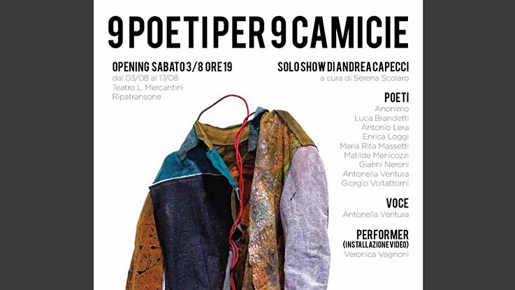 RIPATRANSONE – Sabato 3 agosto alle ore 19 il Teatro Mercantini – situato nel pieno centro storico di uno dei luoghi più magici delle Marche, realizzato nel 1824 e chiuso dopo le scosse di terremoto del 2016 –  riapre finalmente il suo sipario e lo fa dedicando il suo primo appuntamento con il pubblico all’arte contemporanea. Precisamente con la mostra “9 poeti per 9 camicie” di Andrea Capecci. «Merito della volontà di apertura alla cultura e alla celebrazione dell’arte in tutte le sue forme della giunta comunale nella persona del sindaco Alessandro Lucciarini» afferma la curatrice della mostra Serena Scolaro «La ricerca e la sperimentazione di Andrea Capecci nascono dal ritrovamento di alcuni rotoli di lino grezzo appartenenti alla vita quotidiana del passato della sua famiglia. L’artista decide così di recuperare queste stoffe, tingerle e realizzare nove camicie ottenendo qualcosa che, in questo modo, diventa ponte tra quelle che sono le sue origini e ciò che oggi ha a che fare con il suo lavoro e il suo legame con il “giornoxgiorno”».
