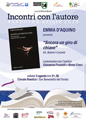 SAN BENEDETTO DEL TRONTO – Per gli “Incontri con l’autore – Estate 2019” Emma D’Aquino presenterà il libro “Ancora un giro di chiave”, sabato 3 agosto alle ore 21,30 al Circolo Nautico Sambenedettese. L’evento è organizzato dall’associazione “I Luoghi della Scrittura”, dalla libreria “La Bibliofila” con il contributo e il sostegno dell’Amministrazione Comunale e della Regione Marche. A conversare con l’autrice saranno Giovanna Frastalli e Remo Croci. EMMA D’AQUINO (Catania, 1966) laureata in Scienze Politiche, in Rai dal 1997, è stata a lungo inviata di Porta a Porta. È stata inviata a New York dopo l’attentato alle Torri Gemelle, ha seguito i più importanti fatti di cronaca, da Cogne all’omicidio di Sarah Scazzi e Meredith Kercher, dal terremoto dell’Aquila al crollo del Ponte Morandi a Genova. Nel 2003 approda al Tg1, lavorando nelle redazioni di Tv7 e Speciale Tg1. Dopo aver condotto il Tg1 delle 13.30, ora conduce anche l’edizione delle 20.00.