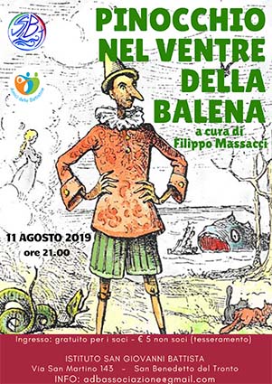 SAN BENEDETTO DEL TRONTO – L’Associazione “Amici delle Battistine” continua il filone degli appuntamenti culturali cimentandosi, questa volta, in “Pinocchio nel ventre della balena” a cura di Filippo Massacci, lettore e relatore appassionato nonchè imperterrito promotore di cultura. L’appuntamento è previsto domenica 11 agosto alle ore 21 presso il Giardino del Chiostro dell’Istituto San Giovanni Battista (Via San Martino 143). Nel febbraio del 1883 vengono pubblicate “Le avventure di Pinocchio”. Un successo straordinario. Tradotto in 240 lingue è il libro italiano più conosciuto e venduto nel mondo. Capace di sopravvivere indenne ai mutamenti dei gusti e delle mode. Forse il romanzo più importante della letteratura italiana dall’unità d’Italia, dice Calvino. Un libro per ragazzi? Un libro per tutti. É la storia di un viaggio. Povertà, vagabondaggio, fate, animali parlanti e tanto altro diventano occasioni di esperienza.
