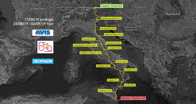 Il percorso scelto da Marco Toppan inizierà in Alto Adige, a Predoi, Comune più a Nord d’Italia, e terminerà a Pachino in provincia di Siracusa. Un viaggio emozionante che sarà possibile seguire anche su Facebook visitando la pagina “Su due ruote nello stivale”, un diario giornaliero di esperienze, emozioni, immagini per unire con un sorriso segnato dalla fatica. Il periodo non è stato scelto a caso: Marco vuole arrivare nelle Marche nell’anniversario del sisma, ma il passo lento delle due ruote non gli permette di essere in tutti i centri colpiti il giorno 24 agosto, notte triste di tre anni fa. Il coraggio non trema, dicono gli Arquatani, e il ciclista veneto sarà a Arquata del Tronto il 28 agosto a sostenere questo coraggio. «É un doloroso ricordo – afferma Toppan- farò in modo che non si dimentichi e darò un caldo abbraccio a tutti quando arriverò a Arquata. Desidero fermarmi in loco e portare la solidarietà dell’Avis di tutta l’Italia».