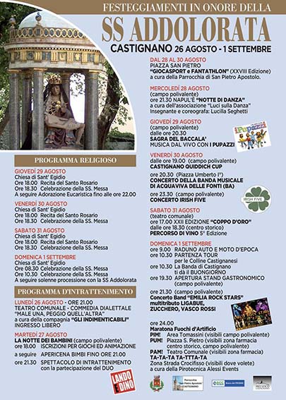 Il gran finale di questo fitto programma sarà infine, come da consuetudine, la prima domenica di settembre. In mattinata la “Banda Città di Castignano” darà come da tradizione il buongiorno al Paese sfilando in musica per le vie, prima di accompagnare nella solenne, sentita e partecipata processione la Santissima Addolorata all’uscita della Santa Messa. Alle 10,30 il previsto raduno di auto e moto d’epoca partirà per un tour per le colline limitrofe. In serata dalle 19,30 presso il campo polivalente apriranno gli stand gastronomici, alle 21,30 inizierà il concerto degli “Emilia Rock Stars” (cover band di Zucchero, Vasco Rossi e Ligabue), ed infine allo scoccare della mezzanotte la Ditta “Alessi Events” illuminerà il cielo con una maratona di fuochi pirotecnici, dislocati in più zone del paese, sancendo la fine di questi lunghi festeggiamenti per Castignano. Info:pagina Fb “Associazione Pro-Loco Castignano” – 339 8370941).