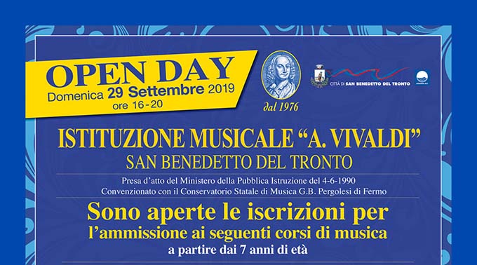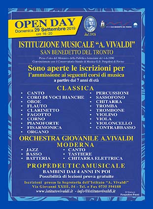 SAN BENEDETTO DEL TRONTO – Anche quest’anno l’Istituzione Musicale “Antonio Vivaldi”, scuola di musica comunale della Città di San Benedetto del Tronto, apre le porte a tutte le persone interessate. E lo fa con l’Open Day, una giornata di apertura al pubblico che consente, in maniera concreta, di far conoscere la struttura e diffondere informazioni sulle sue attività curriculari. L’evento si svolgerà nel pomeriggio di domenica 29 settembre, dalle ore 16 alle ore 20; alle ore 18 verrà proposto anche un rinfresco ed il saluto delle autorità comunali. Ad accogliere i visitatori saranno molti docenti dell’Istituzione che resteranno a disposizione per far conoscere la scuola ed illustrare nel dettaglio tutte le attività didattiche che in essa si svolgono.