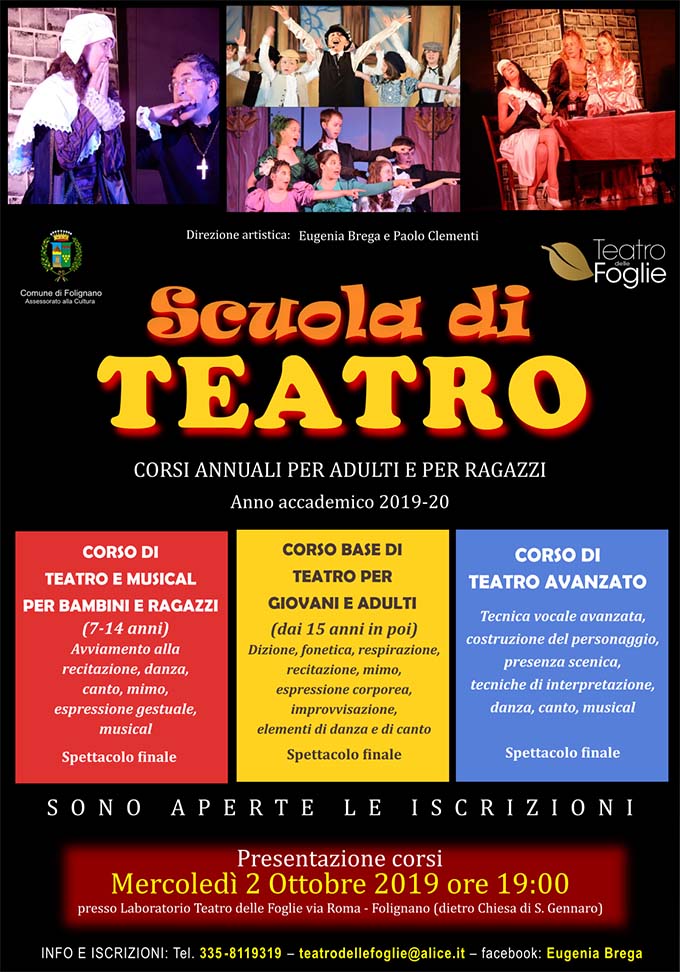 FOLIGNANO – Anche quest’anno riapre i battenti la Scuola di Teatro di Folignano nata dalla collaborazione fra il Teatro delle Foglie e l’Amministrazione Comunale, Assessorato alla Cultura. Nel progettare i programmi per le attività da svolgere in questa scuola formativa per l’annualità 2019-2020, i direttori artistici Eugenia Brega e Paolo Clementi, di concerto con il sindaco Matteo Terrani e la delegata alla cultura Laura Addis, hanno riproposto la formula già sperimentata nelle passate stagioni, un programma di formazione a tutto tondo rivolto ad utenti di tutte le età. Si parte con il Corso di Teatro per bambini e ragazzi dai 7 ai 13 anni proseguendo con il Corso di teatro per Giovani e Adulti con un programma graduale sullo studio e l’approfondimento delle varie discipline dello spettacolo e che riguarda le due branchie fondamentali del teatro: l’espressione vocale e l’espressione corporea, per finire in bellezza con il Corso Avanzato che è dedicato a coloro che frequentano le attività ormai da diversi anni e hanno già acquisito una buona esperienza, volto all’alta formazione teatrale. Si tratta di un vero e proprio avviamento alla professione teatrale.