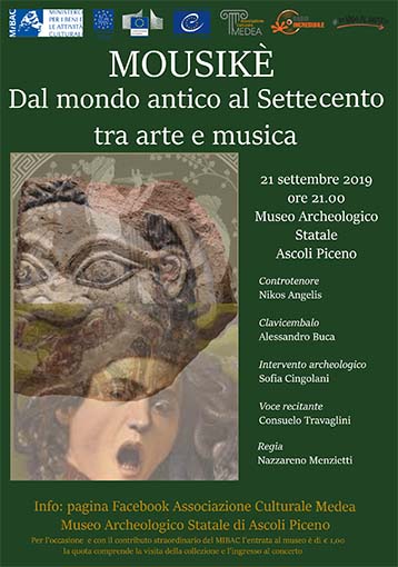 ASCOLI PICENO – Termina il conto alla rovescia per il concerto “Mousikè. Dal mondo antico al Settecento tra arte e musica”, che avrà luogo sabato 21 settembre alle ore 21 nel chiostro della sede di Palazzo Panichi. L’evento – organizzato dal Museo Archeologico Statale di Ascoli Piceno e l’Associazione Culturale Medea, in collaborazione con Radio Incredibile – si svilupperà nell’ambito delle Giornate Europee del Patrimonio, manifestazione culturale promossa dal Mibac nei musei e nei luoghi di cultura italiani. Gli interpreti saranno il controtenore Nikos Angelis accompagnato al clavicembalo da Alessandro Buca con la voce narrante di Consuelo Travaglini. Un viaggio tra musica ed arte: il concerto sarà intervallato dall’intervento archeologico del funzionario responsabile Sofia Cingolani e la descrizione di opere d’arte di Nazzareno Menzietti che ha curato anche la regia dell’evento.