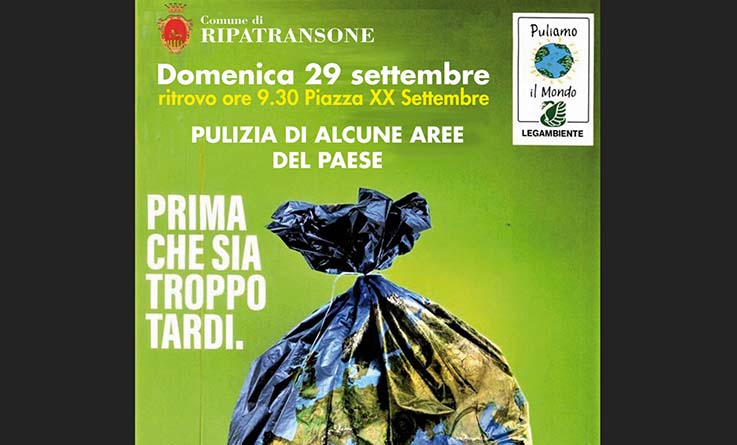 RIPATRANSONE – Torna “Puliamo il Mondo”, la più grande iniziativa di volontariato ambientale organizzata da Legambiente nel mese di settembre in tutta Italia. Per rimuovere i rifiuti abbandonati dagli spazi pubblici, dalle strade e dai parchi, con cittadini di ogni età e nazionalità, amministratori locali, imprese, scuole, uniti da un obiettivo comune: rendere migliore il nostro territorio. A Ripatransone l’iniziativa avrà luogo domenica 29 settembre con ritrovo presso Piazza XX Settembre alle ore 9.30, in collaborazione con il Circolo Legambiente di San Benedetto del Tronto. La manifestazione, patrocinata dall’Amministrazione Comunale di Ripatransone e dall’Assessorato all’Ambiente, prenderà vita come un’autentica passeggiata per le vie cittadine al fine di ammirare le bellezze storico-naturalistiche del Belvedere del Piceno contribuendo alla pulizia della Città. “Puliamo il Mondo” è l’edizione italiana di Clean up the World, il più grande appuntamento di volontariato ambientale del mondo. Portata in Italia nel 1993 da Legambiente che ne ha assunto il ruolo di comitato organizzatore, è presente su tutto il territorio nazionale grazie all’instancabile lavoro di oltre 1.000 gruppi di “volontari dell’ambiente”, che organizzano l’iniziativa a livello locale in collaborazione con associazioni, aziende, comitati e amministrazioni cittadine (dal sito ufficiale della manifestazione).