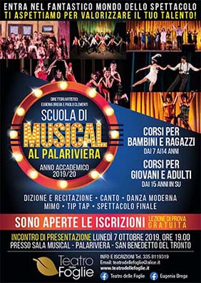 SAN BENEDETTO DEL TRONTO – Lunedì 7 ottobre riaprirà i battenti la Scuola di Musical diretta da Eugenia Brega e Paolo Clementi del Teatro delle Foglie per il nuovo Anno Accademico con un incontro di presentazione aperto a tutti, che si terrà alle ore 19 presso il Palariviera a San Benedetto del Tronto, nel quale verranno illustrate le attività in programma alla presenza di tutti gli interessati. Dopo il grande successo registrato dagli spettacoli rappresentati nel mese di maggio all’Auditorium Palariviera: “La donna che inventò il burlesque” (con gli attori della compagnia) e “Annie dai capelli rossi” (con i bimbi del corso di musical per giovani talenti), la scuola di formazione sulle tecniche del Musical, giunta ormai al suo quattordicesimo anno di attività, riapre le porte anche a nuovi iscritti con la promessa di nuovi successi.