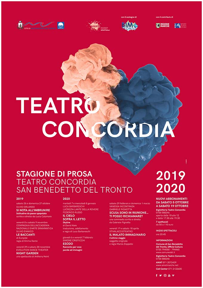 Il sipario del Concordia si alza il 26 e 27 ottobre con Silvio Orlando in “Si nota all’imbrunire (Solitudine da paese spopolato)” di Lucia Calamaro. Venerdì 8 e sabato 9 novembre la Compagnia dell’Accademia Nazionale d’Arte Drammatica Silvio d’Amico porta in scena con la regia di Emma Dante “Le Baccanti” di Euripide. Appuntamento con danza, illusionismo e acrobazie il 29 e 30 novembre con Evolution Dance Theater in “Night garden” spettacolo ideato e coreografato da Anthony Heinl. Luca Barbareschi, Lucrezia Lante Della Rovere e Federico Russo sono i protagonisti, il 7 e 8 gennaio, de “Il cielo sopra il letto (Skyline)” a San Benedetto in unica data regionale. Giovedì 6 e venerdì 7 febbraio la scena è per Simone Cristicchi nello spettacolo “Esodo”, racconto per voce, parole e immagini di un frammento della storia italiana del Novecento attraverso la quotidianità. In unica data regionale, il 29 febbraio e 1 marzo, Vanessa Incontrada e Gabriele Pignotta portano in scena la divertentissima commedia “Scusa sono in riunione… ti posso richiamare?” scritta e diretta da Gabriele Pignotta. Dopo il clamoroso successo nella scorsa stagione, torna nuovamente sul palco del Concordia la commedia dell’arte per l’appuntamento di chiusura, il 17 e 18 aprile, con Stivalaccio Teatro in un divertentissimo “Il malato immaginario. L’ultimo viaggio” ispirato a Molière.
