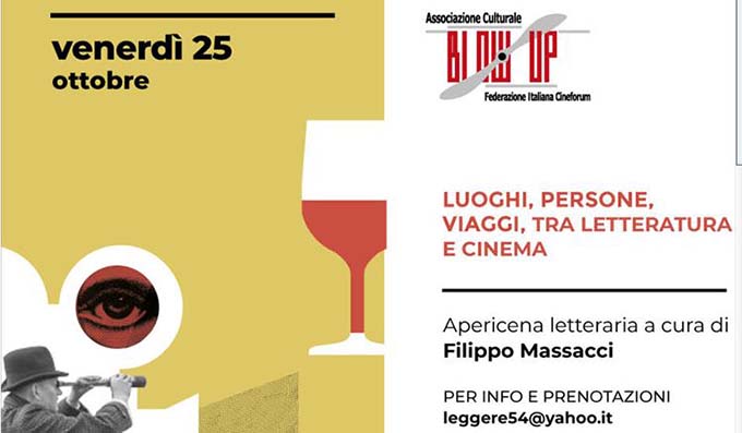 GROTTAMMARE – Quarto specialissimo appuntamento per la 25esima stagione dell’Associazione Blow-Up di Grottammare intitolata CineLocomozioni e dedicata al viaggio, la più grande avventura dell’umanità. Una iniziativa diversa, un’apericena letteraria, con una collocazione diversa, venerdì 25 ottobre alle ore 20, sempre presso l’Ospitale Casa delle Associazioni, a Grottammare Alta. La serata, intitolata “Luoghi, persone, viaggi”, tra letteratura e cinema, sarà coordinata da Filippo Massacci che condurrà i presenti alla scoperta dei viaggi narrati e immaginati.
