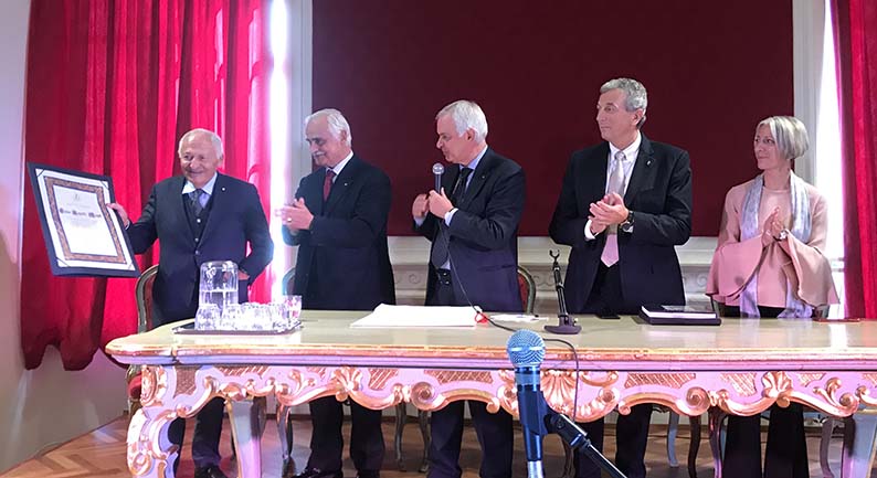 RECANATI – «Leopardi è un poeta vivo perché dà ancora emozioni» ha detto il Maestro Giulio Rapetti Mogol, Presidente della Siae, nel ricevere il prestigioso riconoscimento del Centro Studi Leopardiano “Premio Giacomo Leopardi” a Recanati. A consegnare il Premio l’Ambasciatore Giuseppe Balboni Acqua, Presidente del Comitato Nazionale per le Celebrazioni del Bicentenario de “L’Infinito”, il primo Comitato, nella storia italiana, ufficializzato con decreto parlamentare per la celebrazione del bicentenario di una poesia. «Giacomo Leopardi ci ha insegnato che ogni espressione artistica è manifestazione dell’eccellenza del nostro animo e del nostro pensiero. Voi siete i nostri testimoni, i nostri garanti i protettori delle opere dell’ingegno umano»  così l’Ambasciatore Giuseppe Balboni Acqua si è rivolto  al Maestro Mogol e ai numerosi collaboratori dell’Associazione Italiana Professionisti per la tutela del Diritto d’Autore (Pro.Di.Da.) presenti in sala.