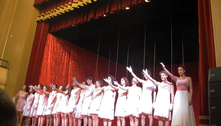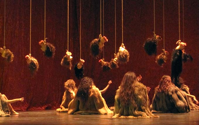 Con il taglio della parte finale – l’esodo e il ritorno di Agave in sé, con la terrificante coscienza dello scempio e il canto di trionfo che diviene lamento funebre – la regia sceglie una messa in scena dominata dalla dirompente bacchica sensualità dell’elemento femminile: qui musica, canto, danza disegnano geometrie convulse ed esplosioni di colore, e gli oggetti anche macabri – le teste mozzate penzolanti dalla graticcia, la croce a un certo punto innalzata – sono grumi simbolici che inchiodano l’attenzione e rendono lo spettatore parte dell’incantesimo collettivo.
