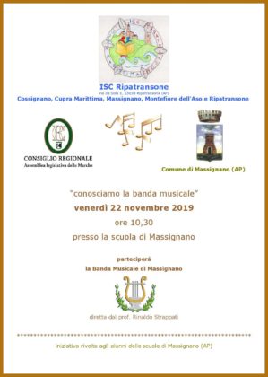 MASSIGNANO – La scuola di Massignano, grazie all’interessamento della dirigente dott.ssa Gaia Gentili, apre le porte anche quest’anno alla Banda Musicale paesana. L’iniziativa “Conosciamo la Banda Musicale” è rivolta agli alunni della scuola di Massignano per avvicinarli al mondo della musica. La banda paesana, diretta dal prof. Rinaldo Strappati, venerdì 22 novembre incontrerà gli studenti della scuola, eseguirà alcuni brani e farà conoscere vari strumenti musicali a fiato. In questa giornata sarà presente anche il tubista Gianmario Strappati, affermato concertista, che eseguirà alcuni brani musicali con i quali metterà in evidenza le sue grandi doti tecniche.