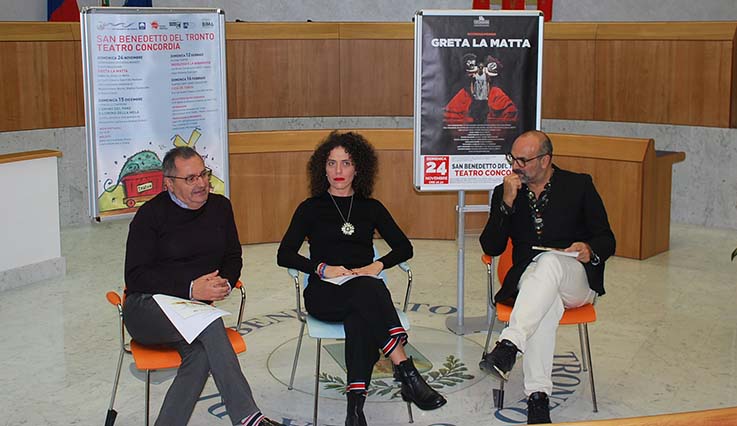 SAN BENEDETTO DEL TRONTO – É stato presentato venerdì 15 novembre, in Sala Consiliare, il cartellone “Domenica in Famiglia” dall’assessore alla cultura Annalisa Ruggieri, il direttore Amat Gilberto Santini e il presidente di Bim Tronto Luigi Contisciani. Realizzato dai due enti con il contributo di Mibact Direzione Generale dello Spettacolo e della Regione Marche e con il sostegno di Bim Tronto, il programma è dedicato ai più giovani e propone quattro titoli per trascorrere una giornata diversa con tutta la famiglia. Quattro gli appuntamenti, a partire dal prossimo 24 novembre. Il via alla rassegna con la Compagnia Occhisulmondo (in coproduzione con Fontemaggiore) con Greta la matta – tratto dal libro illustrato per bambini Greta la Matta di Carll Cneut e Geert De Kockere –, una creazione collettiva di Massimiliano Burini, Matteo Svolacchia e Giulia Zeetti. Spettacolo vincitore della menzione speciale al Premio Scenario Infanzia 2014, Greta la matta è una fiaba contemporanea che mescola la narrazione in rima, la danza e il teatro di figura e che si adatta alla nostra realtà, dove spesso la diversità è costretta a nascondersi o ad essere allontanata.
