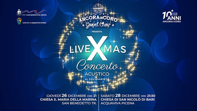 SAN BENEDETTO DEL TRONTO – In occasione del decimo anniversario della sua fondazione, AncorainCoro Gospel Choir il prossimo dicembre tornerà ad animare le festività natalizie della provincia con lo spettacolo “Live Xmas” – Concerti Acustici di Solidarietà. Due le date previste, la prima giovedì 26 dicembre, alle ore 21, presso la Basilica Cattedrale di Santa Maria della Marina a San Benedetto del Tronto e la seconda sabato 28 dicembre, alle ore 21.30 presso la Chiesa di San Nicolò di Bari ad Acquaviva Picena. Oltre cinquanta cantori, accompagnati da pianoforte e tastiere, si esibiranno in performance acustica, attraverso un repertorio rinnovato e tratto dalla migliore tradizione natalizia anglosassone e italiana, in cui non mancheranno anche omaggi al genere Pop. Anche quest’anno la formazione classica dell’AncorainCoro Gospel Choir sarà arricchita dall’entusiasmo dei bravissimi ragazzi dell’AiC Academy, la scuola di canto corale nata come vivaio di voci del gruppo musicale principale. L’ingresso sarà gratuito e il ricavato delle libere offerte raccolte sarà destinato a sostenere Onlus attive nel nostro territorio. L’evento è organizzato con il supporto e la collaborazione della Diocesi di San Benedetto del Tronto – Ripatransone – Montalto, la Parrocchia di Santa Maria della Marina, la Parrocchia di San Nicolò e le amministrazioni comunali di San Benedetto del Tronto e Acquaviva Picena.
