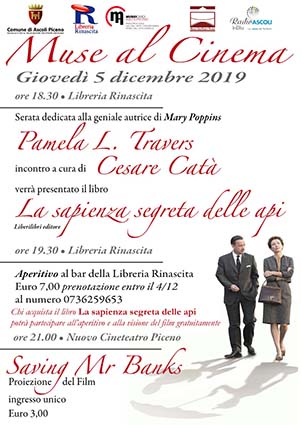 ASCOLI PICENO – Torna la rassegna dedicata a cinema, arte, musica, letteratura e filosofia. Giovedì 5 dicembre, alle ore 18.30 presso la libreria Rinascita, terzo capitolo di Muse al Cinema Winter Edition con Cesare Catà e “Saving Mr Banks” di John Lee Hancock. Dopo l’esordio dello scorso 30 ottobre, dedicato al tema “La dissoluzione della Jugoslavia e il massacro di Srebrenica” e il secondo appuntamento che ci ha dato la possibilità di incontrare Filippo Tuena, la sua opera-mondo “Le Galanti” e la riscrittura del “Sogno” Shakespeariano, “Com’è trascorsa la notte”, il tutto seguito dalla proiezione del classico di Woody Allen “Commedia Sexy di una notte di mezza estate”, Le muse al Cinema Winter Edition continua il prossimo giovedì 5 dicembre a partire dalle 18.30 con l’incontro, nella libreria Rinascita, con Cesare Catà che presenterà il testo da lui curato “La sapienza segreta delle api” dell’autrice di Mary Poppins, Pamela Lyndon Travers, che ci immergerà in un contesto magico fatto di laboriosi insetti alati, folletti e creature silvane. A seguire, alle 19.30 aperitivo a cura di libreria Rinascita e alle 20.30 nel Nuovo Cineteatro Piceno la proiezione del film”Saving Mr Banks” di John Lee Hancock, che racconta il tormentato rapporto tra l’autrice di Mary Poppins e il suo editore che cerca di convincerla a cedere i diritti del suo libro a Walt Disney. Costo: 7 euro aperitivo + 3 euro cinema – partecipazione gratuita per chi acquista il libro. Info e prenotazioni al numero 0736/259653.
