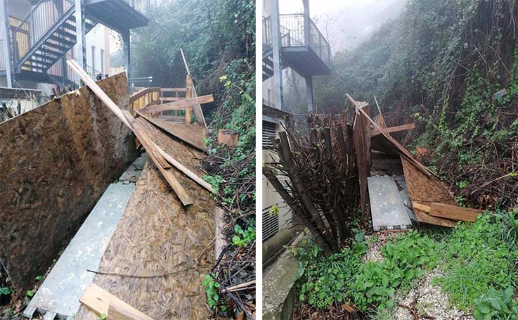 RIPATRANSONE – Il gruppo consiliare di opposizione a Ripatransone, Progetto Paese, torna a segnale una situazione rimasta immutata nel tempo. «Più di due mesi fa, avevamo sollevato la criticità, anche tramite stampa, della passerella finale della scala antincendio o di sicurezza, realizzata quale via di emergenza dell’Isc locale, ma eravamo stati accusati di mancanza di argomentazione e di spessore. – dichiarano i consiglieri – Noi che volevamo semplicemente richiamare l’attenzione sulla pericolosità di una costruzione che si appoggiava su delle “foratelle” messe una sopra all’altra su un terreno per nulla solido. Oggi, dopo il maltempo, ci ritroviamo con la passarella completamente ostruita da tavole e assi. Sarà ancora considerata uscita di sicurezza? Ai posteri l’ardua sentenza».