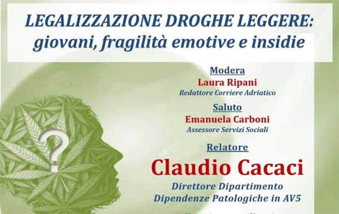 Il 19 dicembre sarà la volta di un argomento scottante inerente la “Legalizzazione delle droghe leggere: giovani, fragilità emotive e insidie” con relatore il dott. Claudio Cacaci, il quale, dopo la relazione colloquierà con l’assessore Baiocchi, la consigliera Brunilde Crescenzi ed il pubblico. L’incontro sarà moderato dalla giornalista Laura Ripani del Corriere Adriatico. É previsto il saluto di apertura lavori da parte dell’assessore alle Politiche Sociali Emanuela  Carboni, la cui presenza è però in forse a causa del gravissimo lutto che l’ha colpita. «Alla famiglia Carboni le più sentite condoglianze – aggiunge l’assessore Antonella Baiocchi – e alla cara Emanuela in particolare, un forte abbraccio colmo di partecipazione ed affetto».