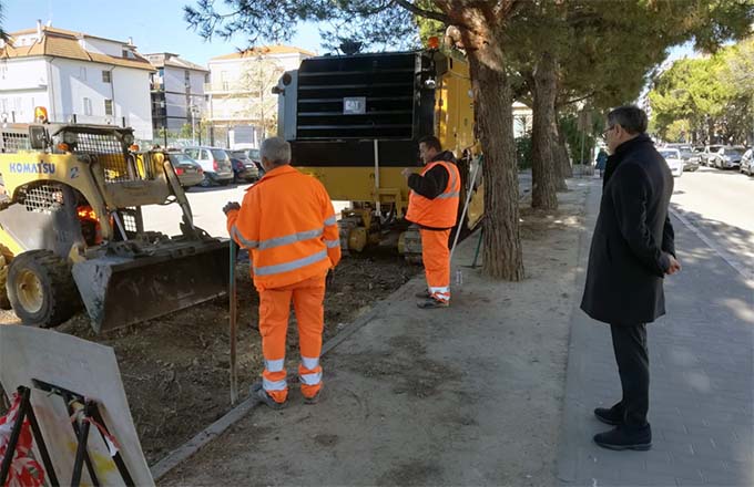 SAN BENEDETTO DEL TRONTO – Con una spesa complessiva di 58mila euro e un appalto affidato alla ditta Adriatica Bitumi spa, il settore Lavori pubblici del Comune di San Benedetto sta intervenendo in vari punti della città dove le radici dei pini hanno pesantemente rovinato la pavimentazione stradale con conseguenti rischi sia per il passaggio di pedoni che per il transito di autoveicoli. Gli interventi consistono nella scarifica con asportazione delle radici più superficiali, in modo da non compromettere la salute degli alberi, e la sistemazione prima con cemento e poi con il nuovo tappetino bituminoso. L’operazione è stata condotta prima di Natale nella zona nord della città, in via Zanella angolo via D’Annunzio e lungo il lato nord di via Verga dove la Ciip ha colto l’occasione per rifare un tratto di condotta dell’acqua potabile. In questa settimana la ditta sta operando sul lungomare Trieste, dinanzi alla pineta di via Zara, e poi nel parcheggio di viale De Gasperi antistante il parco Woijtyla e in via Lombardia nei pressi del Liceo Classico. Per la prossima settimana è previsto l’intervento più esteso che riguarderà 1500 metri quadrati dell’asse via Sgambati/ via Scarlatti fino all’incrocio con via Zandonai e, infine, la zona di piazza del Cristo Re Redentore.