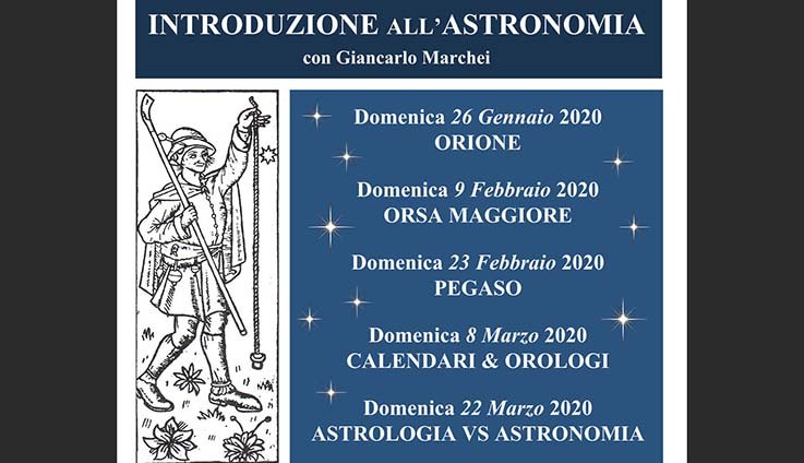 MONTEPRANDONE – L’associazione teatrale “Anime sul palco”, con il patrocinio del Comune di Monteprandone, organizza cinque incontri domenicali dedicati all’astronomia, tenuti da Giancarlo Marchei. Si partirà domenica 26 gennaio con un approfondimento sulla costellazione Orione, per poi proseguire nel mese di febbraio con due incontri: il 9 febbraio si parlerà dell’Orsa Maggiore, mentre il 23 febbraio della costellazione Pegaso. La rassegna culturale si concluderà nel mese di marzo: si parlerà di calendari ed orologi l’8 marzo e della differenza tra astronomia e astrologia il 22 marzo. «Ringraziamo l’associazione “Anime sul palco” sempre attiva sul nostro territorio per quanto riguarda le attività teatrali – dichiara il presidente del Consiglio comunale con delega alla cultura Roberta Iozzi – che, organizzando questa rassegna dedicata ad un tema affascinante come l’astronomia, si apre ad altri “universi” culturali e ci offre un interessante approfondimento sulle stelle e l’universo». Gli incontri, ad ingresso gratuito, si terranno presso la sala audiocinema del GiovArti, con inizio alle ore 17. Per informazioni: 366/3150024.