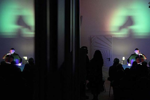 Franchellucci e (è) il violoncello. Che lui suona “interagendo e giocando” con il riverbero non trattato di questo originalissimo spazio minimalista, con un’acustica che non è quella di un teatro, ma qui non è un difetto. Perfino il ronzio dell’aria condizionata dentro il lungo tubo sopra le foto si integra a quella sorprendente musica-non-musica. Musica non scritta e non letta. Improvvisata. Fantasiosa. Ardita. E ovviamente preparata, calcolata, studiata, sperimentata. Le dissonanze mai stridenti al posto delle armonie, gli arpeggi saltanti, senza gabbie melodiche: non-suoni di vario registro, mai rumori.