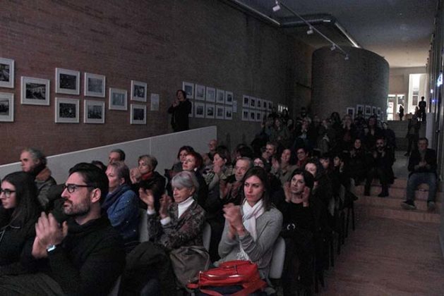 Non lo vediamo, ma al concerto stasera c’è anche Mario Dondero. Figurati se manca, nella “sua” Fermo, nel “suo” Terminal, invisibile ma presente come in ognuna delle sue 80 foto-reportage di vita ordinaria nel mondo “ritrovate” – ma “segnate” da lui stesso – ben allineate sulla parete di mattoni lunga. Chissà, potrebbe essersi istintivamente nascosto “dentro” quel gruppetto di laboriosi fotografi; tra le file del pubblico (la macchina fotografica sotto la giacca); tra i rari passanti che dall’esterno sbirciano attraverso le magrissime finestre; dietro l’isola curva dell’ingresso, ad osservare non visto chi entra, e magari a fotografarlo… O forse è lui che si diverte laggiù a creare quegli improvvisi rumori d’ambiente – scricchiolii, imbarazzati colpi di tosse, porte o portiere di auto che si aprono/si chiudono – cioè quei “riverberi di scena”… che stasera servono. Insomma Dondero qua c’è di sicuro, ma non cercatelo. Potrebbe, ed è più probabile, che stia proprio “dentro” il violoncello di Giuseppe Franchellucci. Lo si sente.