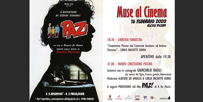 ASCOLI PICENO – Dopo la sentita partecipazione al sesto appuntamento, tenutosi nei Musei della Cartiera Papale di Ascoli Piceno in collaborazione con L’Isml per la Giornata della Memoria, domenica 16 febbraio torna Muse al Cinema. Alle ore 18 Carlo Bachetti Doria terrà alla Libreria Rinascita una conversazione su L’umorismo piceno: dal Carnevale ascolano ad Andrea Pazienza. Alle ore 19.30 l’incontro proseguirà con un aperitivo a cura della libreria stessa, mentre alle ore 21.00 presso il Nuovo Cineteatro Piceno lo scenografo Giancarlo Basili dialogherà con Carlo Bachetti Doria e Alberto De Angelis. A seguire si potrà assistere alla proiezione del film Paz! di Renato De Maria.