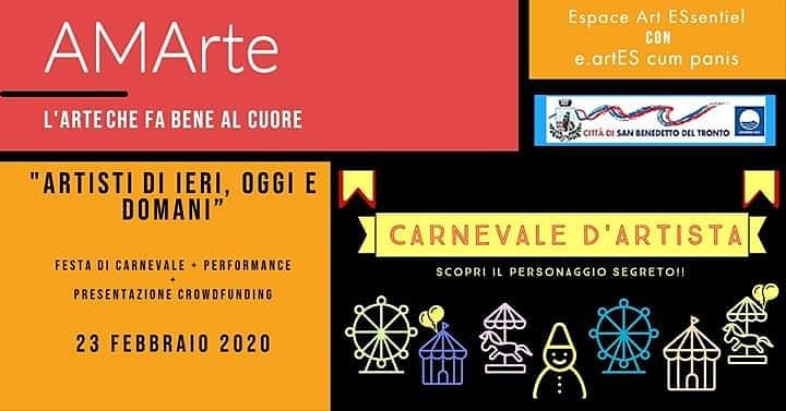SAN BENEDETTO DEL TRONTO – Domenica 23 febbraio, presso lo spazio artistico “Espace Art ESsentiel” (in via Madonna della Pietà 80), si terrà il secondo appuntamento del progetto “AMArteAMArte – l’arte che fa bene al cuore” promosso dalla Aps “e.artES cum panis” e dalla Asd “Espace Art ESsentiel”, con il patrocinio del Comune di San Benedetto del Tronto. “AMArte” prevede seminari, spettacoli, performance in site specific, feste sociali e collaborazioni con scuole e enti regionali per il recupero artistico-ambientale. Per la seconda serata del progetto gli organizzatori hanno pensato ad una festa e l’occasione del Carnevale offre uno spunto goliardico per condividere un momento insieme di creatività ed allegria.