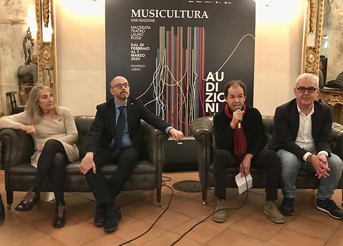 Il programma delle audizioni live è stato presentato in una conferenza stampa al Teatro Lauro Rossi dal Direttore Artistico di Musicultura Ezio Nannipieri alla presenza del Sindaco di Macerata Romano Carancini, l’Assessore alla Cultura Stefania Monteverde, Paola Promisqui, il Rettore dell’Università di Camerino Claudio Pettinari, il Professor Marcello La Matina dell’Università di Macerata e la Direttrice dell’Accademia delle Belle Arti di Macerata Rossella Ghezzi. In apertura di conferenza stampa immancabile il ricordo a Piero Cesanelli, fondatore e amato direttore artistico di Musicultura, la moglie Paola Promisqui ha presentato un nuovo progetto in sua memoria, per diffondere la conoscenza della sua articolata personalità, delle sua opera di artista e delle sue grandi attività nel mondo della cultura.