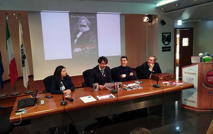 ANCONA – «Scrivo libri ma non li leggo. Anzi non ho letto nemmeno questo di cui parliamo oggi perché se leggo mi viene sonno». Così si presenta Piero Massimo Macchini, alias Piero Marximo, introducendo oggi in Regione la sua ultima fatica letteraria, “Manifesto Radical Grezzo”, lanciando così anche l’apertura del suo “tour elettorale”. Perchè in definitiva, in 54 punti, tanti sono quelli del suo programma politico, Macchini – attore, comico, clown, mimo, fantasista e autore – si candida alle prossime elezioni come presidente e lo fa sulla falsariga del più famoso Manifesto di partito. La foto in copertina è quella storica di Carlo Marx con il viso dell’attore fermano. In conferenza stampa si è portato un suo palco con microfoni incorporati, spille elettorali, bandierine  e sponsor ( tra cui un’agenzia funebre) alla maniera americana.