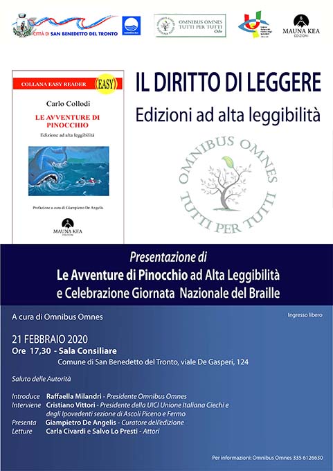 SAN BENEDETTO DEL TRONTO – Un appuntamento imperdibile quello di venerdì 21 febbraio alle ore 17,30 presso la Sala Consiliare del Comune di San Benedetto del Tronto: “Il diritto di leggere”, organizzato dalla Omnibus Omnes con la collaborazione della Uici, Unione Italiana Ciechi e Ipovedenti, sezione di Fermo e Ascoli Piceno, e con il patrocinio del Comune di San Benedetto del Tronto. Un incontro che coniuga due capisaldi della società civile, la cultura e il diritto alla lettura. Durante l’evento, introdotto da Raffaella Milandri, ideatrice della iniziativa, ci sarà l’intervento di Cristiano Vittori, presidente della Uici sezione di Fermo e Ascoli, che nell’occasione parlerà della ricorrenza, proprio il 21 febbraio, della Giornata Nazionale del Braille. Verrà presentato il volume “Le Avventure di Pinocchio” in edizione ad alta leggibilità, a cura di Giampietro De Angelis, della casa editrice sambenedettese Mauna Kea: il volume è solo il primo di una collana di grandi classici e non solo, dedicati ad un pubblico adulto, e ad alta leggibilità. Per chi ha problemi di lettura dovuti alla ipovisione o semplicemente all’avanzare della età, molte edizioni sono infatti proibite: caratteri piccoli e troppo ravvicinati fra loro non permettono di avvicinarsi alla carta stampata, se non con serie difficoltà. «È fondamentale garantire il diritto di leggere. – dice Raffaella Milandri, Presidente della Omnibus Omnes – Soprattutto a chi ha problemi di vista e non ha un buon approccio con il libro digitale; o con l’audiolibro, che è invece una soluzione eccellente per chi ha una ipovisione grave». Il progetto prevede anche che le opere ad alta leggibilità possano essere trasformate in braille, non in vendita ma a disposizione della comunità. Durante l’incontro parteciperanno, con letture del volume di Pinocchio, gli attori Salvo Lo Presti e Carla Civardi.